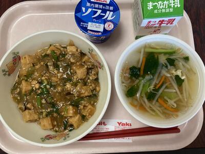 【メニュー】ピリ辛生揚げ丼 牛乳 小松菜スープ ヨーグルト