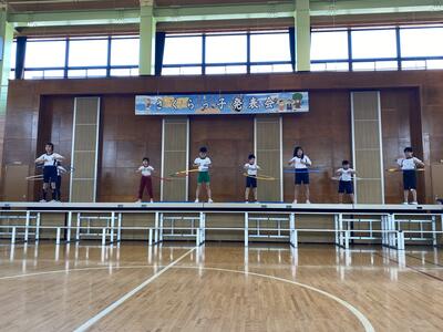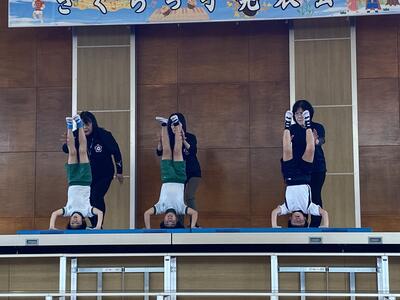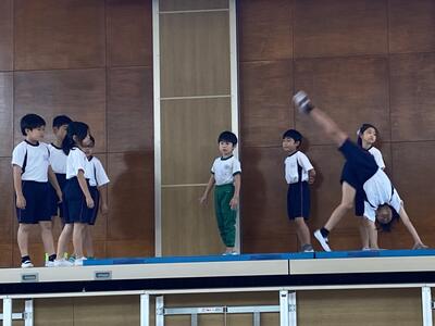 試験内容は実に多才な力が求められました。英語の歌・早口言葉・マット運動(前転からの開脚前転、側転)・倒立・フラフープ、立派にすべての試験をクリアーして合格しました。劇の最後には、これからの学習予告もするなど、3月の総合的な学習の時間のまとめが楽しみです。
