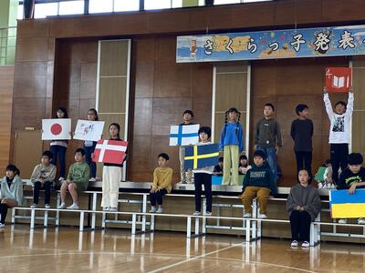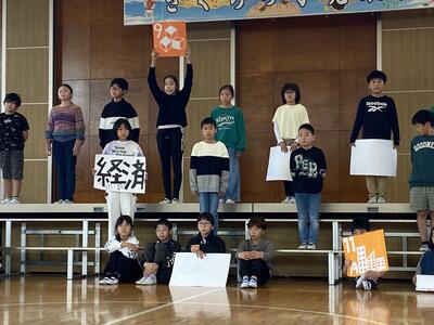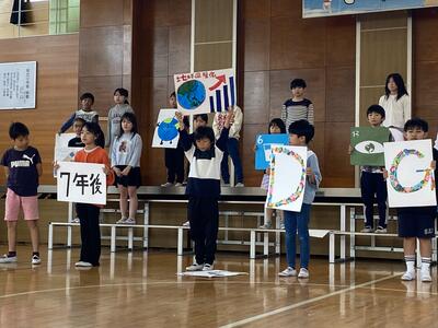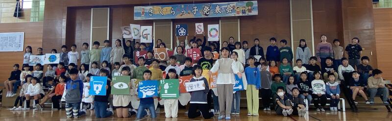 2023年10月31日 15時22分4年生の発表は「総合:SDGsって何?」です。SDGsという言葉やSDGsにかかわりがある取組が、テレビ等で耳にする機会が多くなりました。4年生は、そのことに着目して総合的な学習の時間に調べたことについて発表しました。ダンスキャンプで練習したダンスをはさみながら、学級ごとに発表をしました。