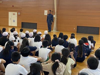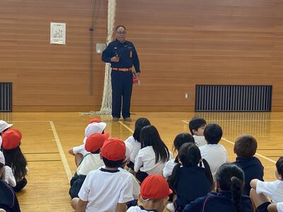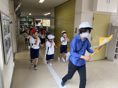 今年度3回目の避難訓練です。あいにくの雨となったため、想定を変更して「地震発生→近隣の住宅で火災が発生→延焼の恐れがあるためにいったん体育館に避難」としました。当初の予定では、子どもたちの校庭避難に合わせて消防団の方々に放水訓練をしていただき、より緊張感をもって訓練に参加できるようにするはずでした。しかし、残念ながら雨のために実施できませんでした。