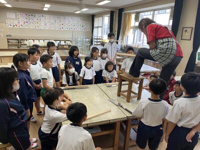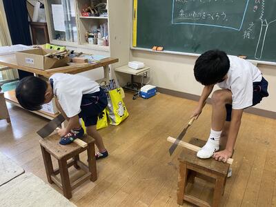 「のこぎり」を使って、木を切って・つないで、楽しいものをつくることがねらいの学習です。ほとんどの子たちが「のこぎり」初体験なので、メインの道具となる「のこぎり」の使い方の丁寧に、そして確実に確認をして練習をしました。楽しい活動も、安全が確保されてこそです。