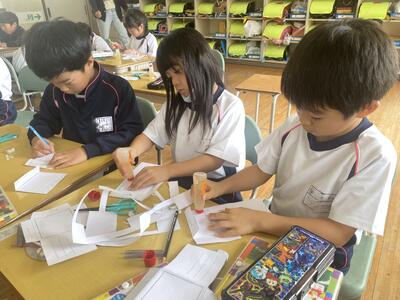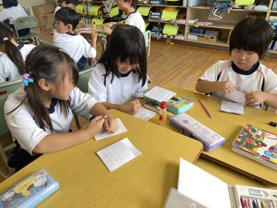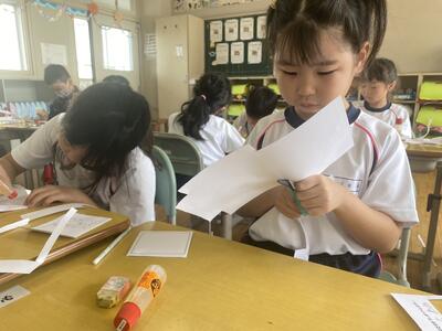 その朝顔の種を入れるための封筒をつくりました。表には朝顔の絵をかきました。裏にはメッセージと自分の名前を書きました。喜んでもらえるよう、真剣に丁寧につくりました。