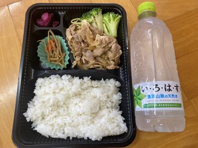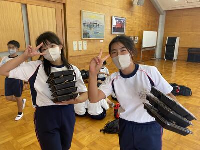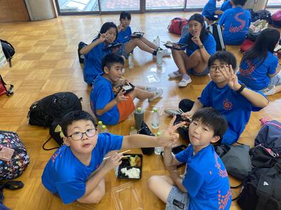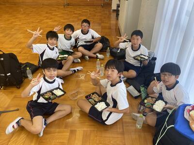 まずは、お待ちかねのお昼ご飯です。メニューは焼肉弁当です。ここからは班行動です。食事は生活班で食べます。食事係が、メンバーのお弁当と水を受け取り、いただきますです!