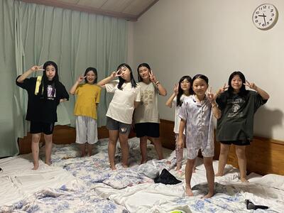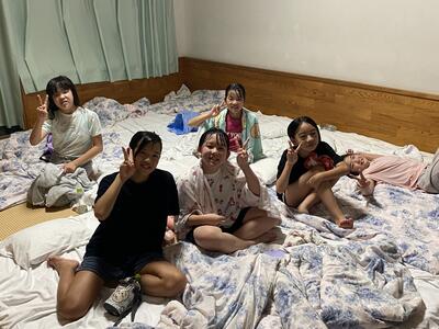 ①暑いので熱中症予防に、水分補給をこまめにしましょう。②宿泊部屋には、クーラーはないので窓を開けますが、虫が入ってくるので、網戸は閉めて使いましょう。③次に使う人のために、部屋の掃除を丁寧にしましょう。④食事はバイキングなので、食べすぎて気持ち悪くならないように気をつけましょう。⑤お風呂では、ふざけたり走ったり泳いだりしないようにしましょう。の5つにベッドメイキングやその他の安全な生活について説明がありました。
