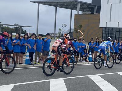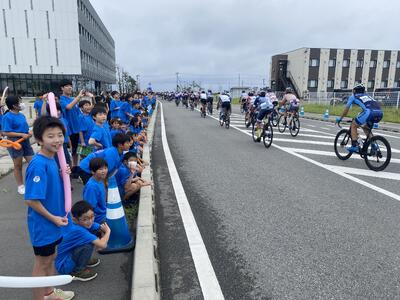 伝承館を出るタイミングで、ツール・ド・ふくしま福島復興サイクルロードレースのために交通規制がかかってバスが発車できなくなりました。当初は、迂回できるとのことでしたが、予定が変わったようです。せっかくなので、沿道で声援を送りました。
