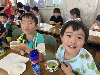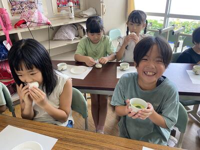 会では、上田リーダーがお抹茶を立ててデモンストレーションをし、子どもたちも少し抹茶が入ったお茶をいただきました。そして、田中チーフ手作りのもち米団子と梨が振舞われ、子どもたちの元気も最高潮です。