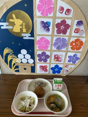 今年の十五夜は来週17日です。ところが、17日は5年生が宿泊学習の振替となるために給食がありません。そこで、一週はやめてお月見献立を提供しました。ホタテは、学校給食会からの提供食材です。これをあげてまん丸月に見立てました。写真の背景は、毎月さくら2学級の子どもたちが手作りして届けてくれる掲示物です。