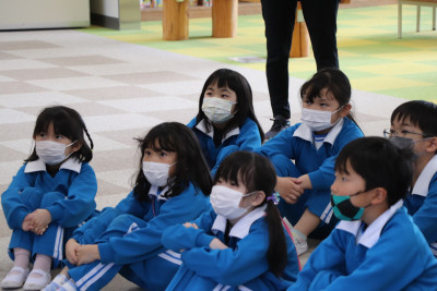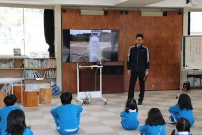 避難の後は、消防署の方からのお話を聞き、その後は低学年学習室でスモーク体験を行いました。かなりのスモークの量で、子どもたちは圧倒されながらも、身を低くしながら真剣に訓練に臨んでいました。