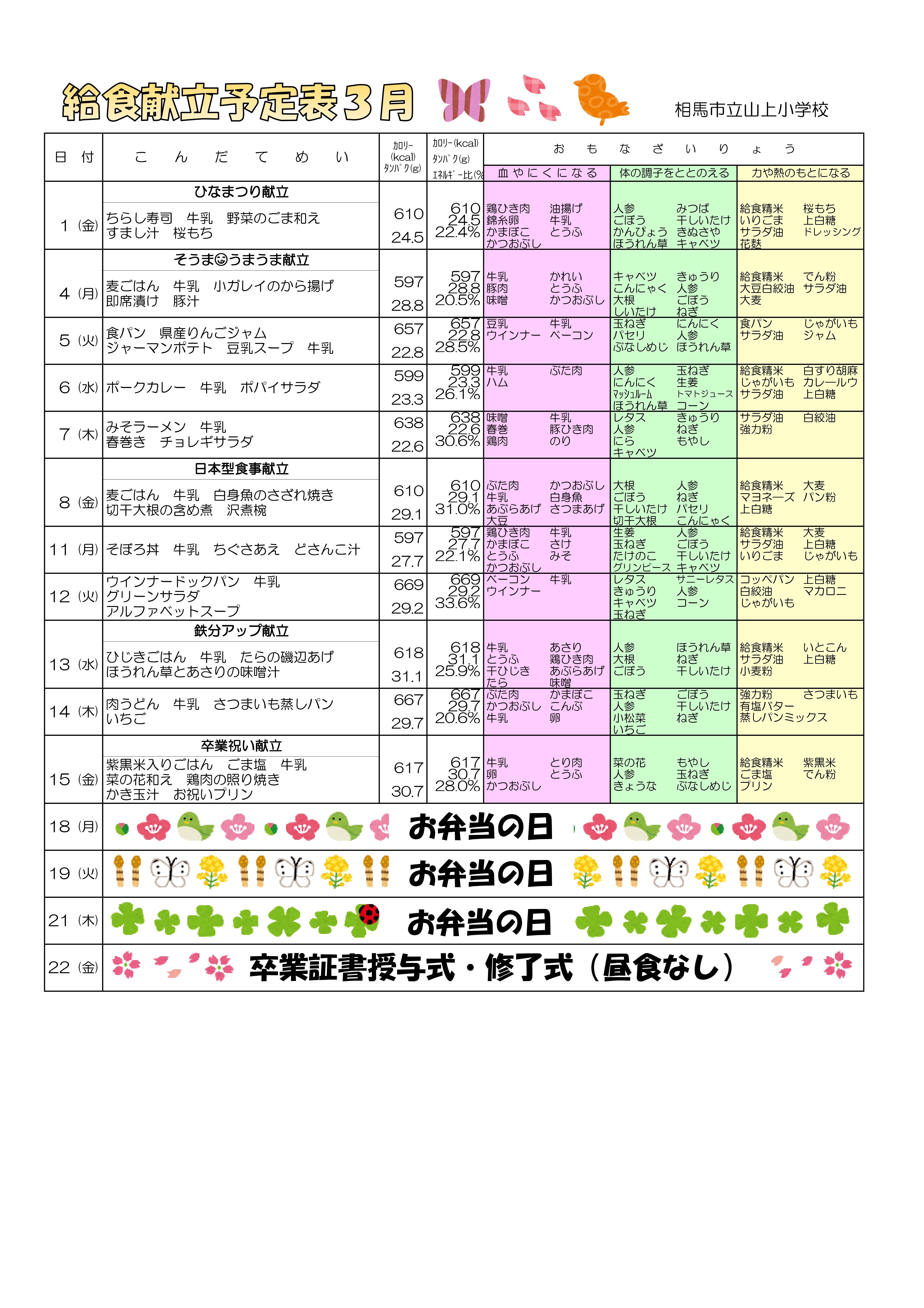 給食献立予定表3月