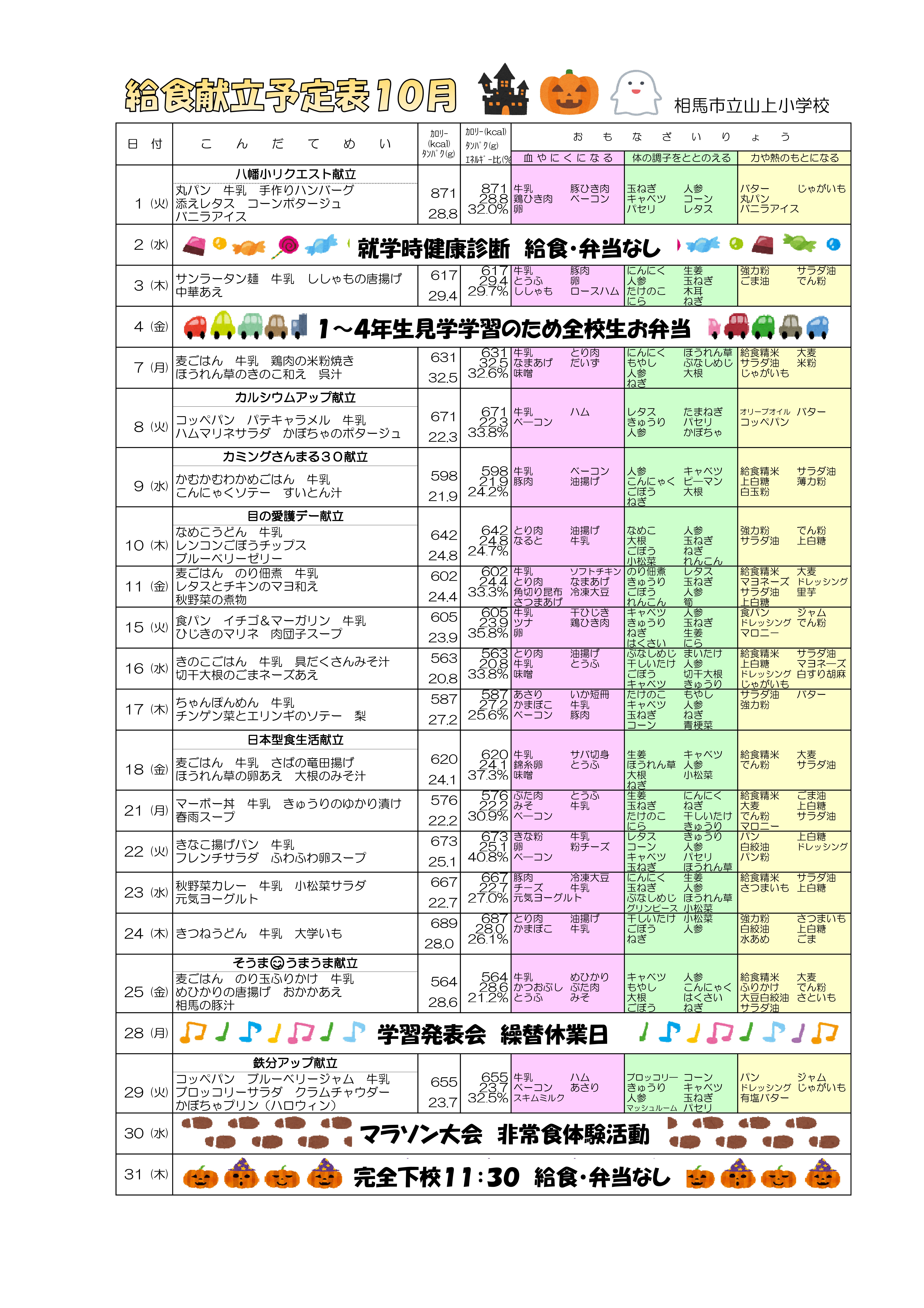 給食献立予定表10月