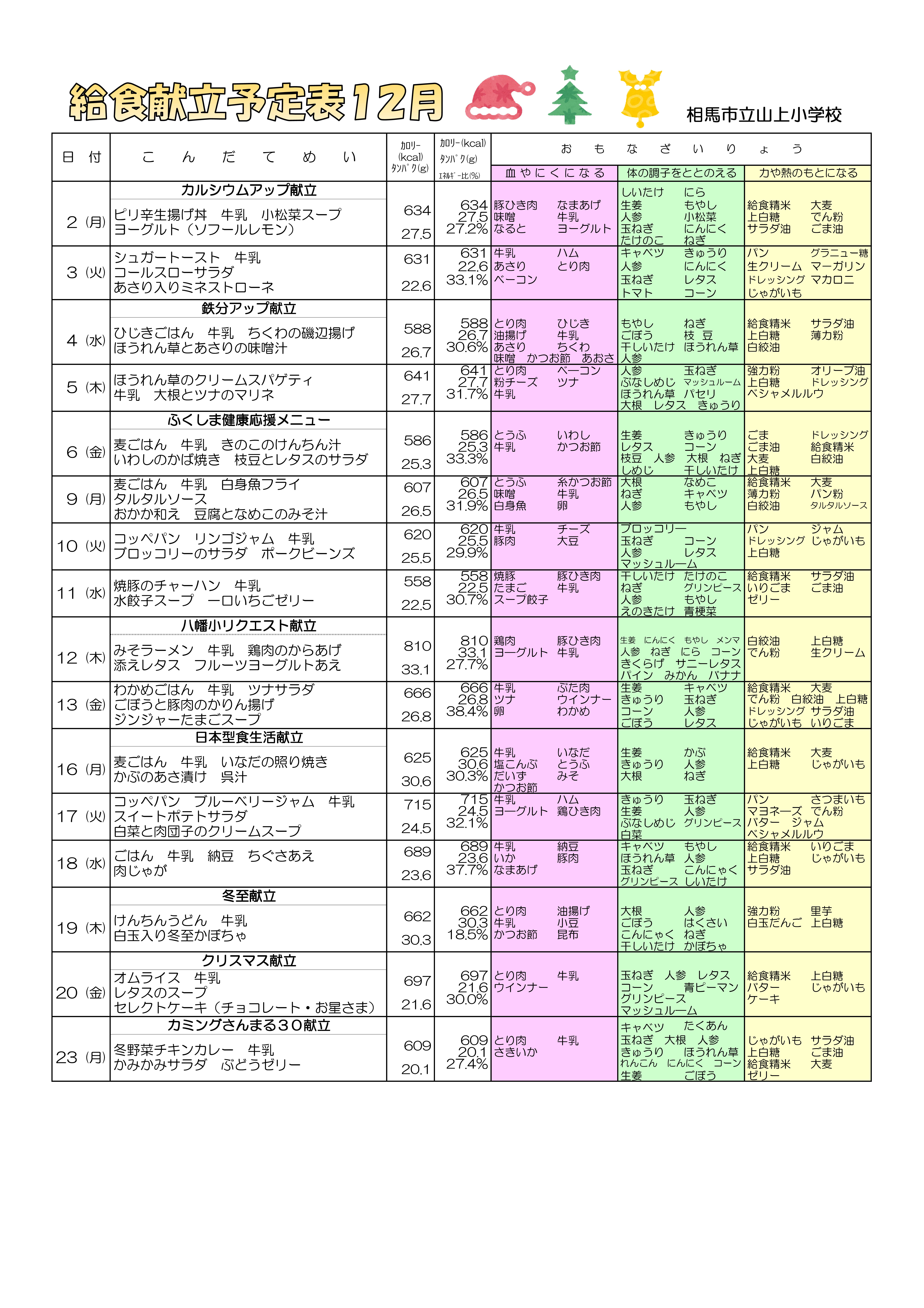給食献立予定表12月
