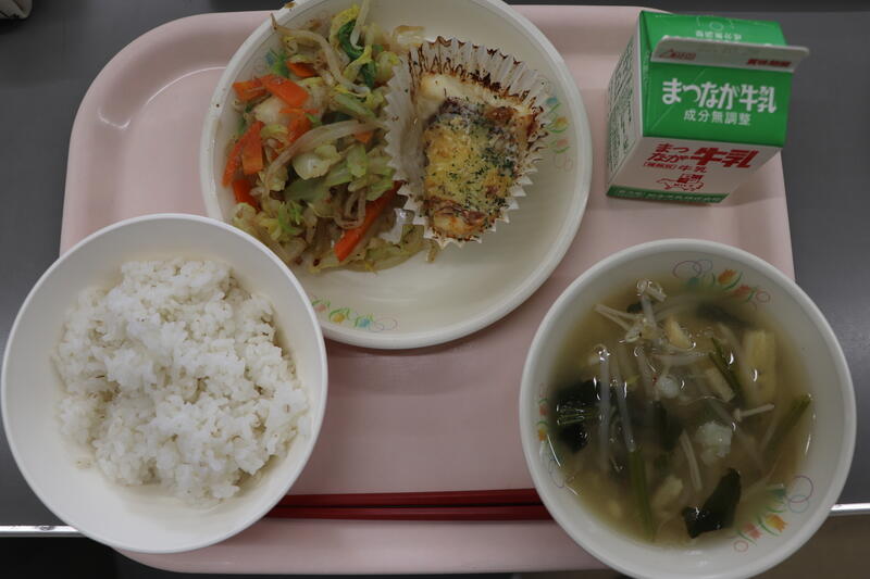 今日の給食は「麦ごはん、五目納豆、ぶりの照り焼き、青のりのみそ汁」です。