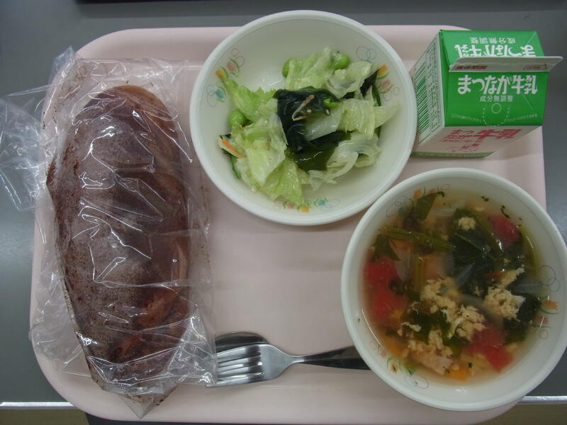 今日の献立は「ココア揚げパン、わかめサラダ、イタリアンスープ」です。