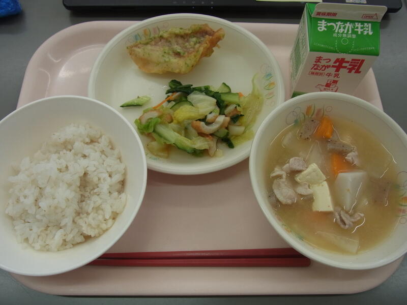 今日の献立は「ごはん、真鯛フライ、のり酢和え、五目汁」です。