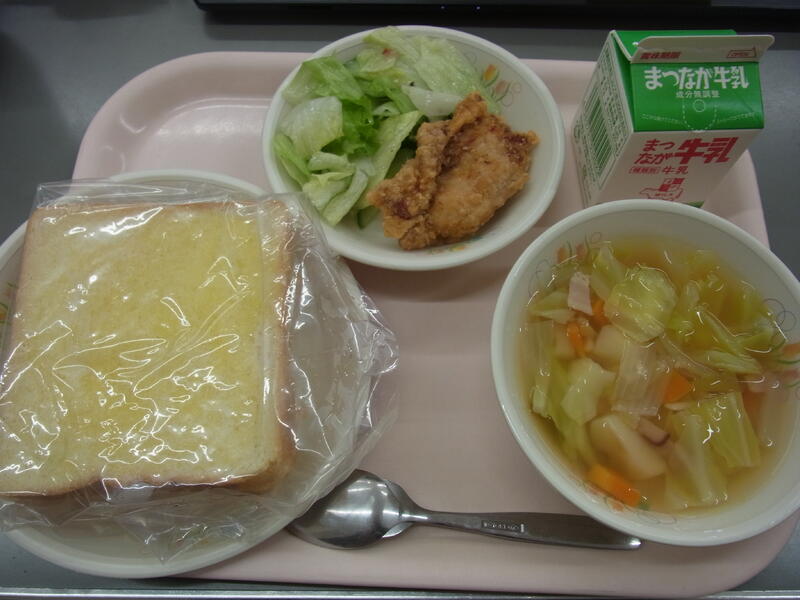 今日の給食は「シュガートースト、鶏のからあげ、添え野菜、アルファベットスープ」です。