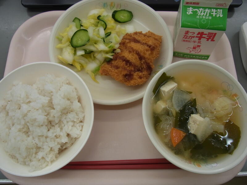 今日の給食は「麦ごはん、チキンカツ、柚子漬け、大根のみそ汁」です。