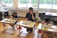 その後、1年生教室で子どもたちと一緒に給食を食べていただきました。