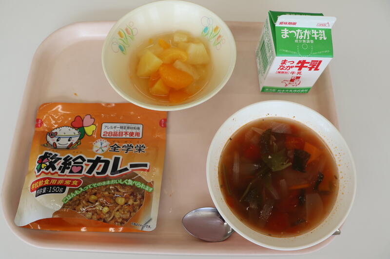 今日の給食は「救給カレー、さば缶とトマトのスープ、フルーツポンチ」です。