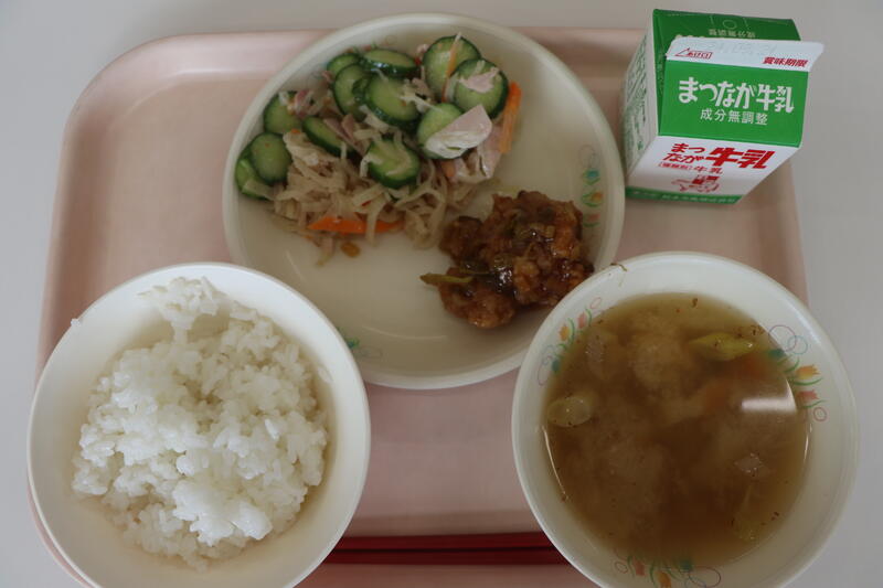 18日(水)の給食は「ごはん、鶏肉のねぎだれかけ、ハリハリあえ、南蛮汁」です。