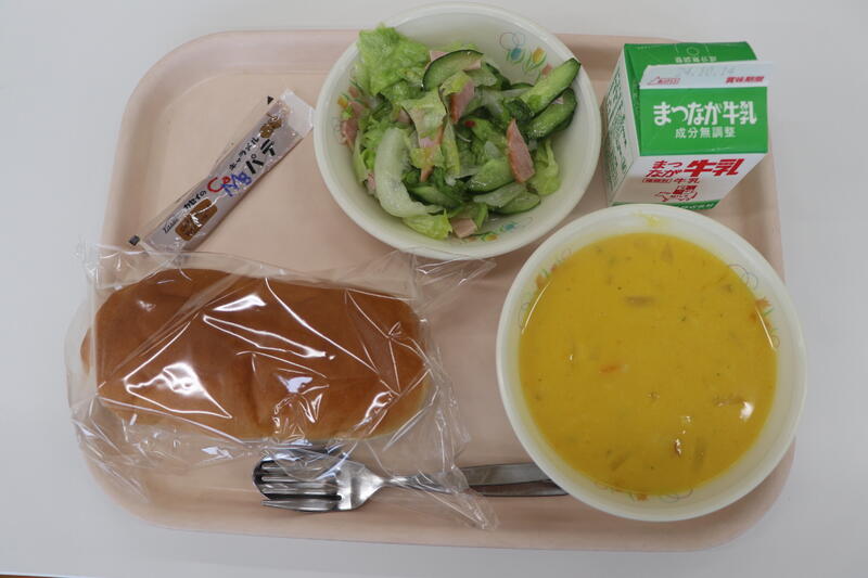 今日の給食は「コッペパン、パテキャラメル、ハムマリネサラダ、かぼちゃのポタージュ」です。