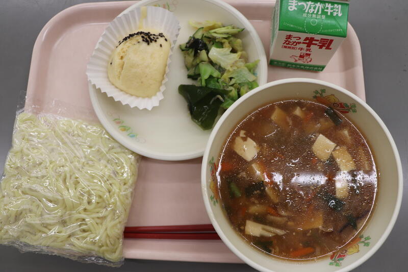 今日の給食は「マーボーめん、ちりめんじゃこ和え、マーラーカオ」です。