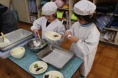 1・2年生教室では、「おいしそう!早く食べたい!」という声が聞こえてきました。