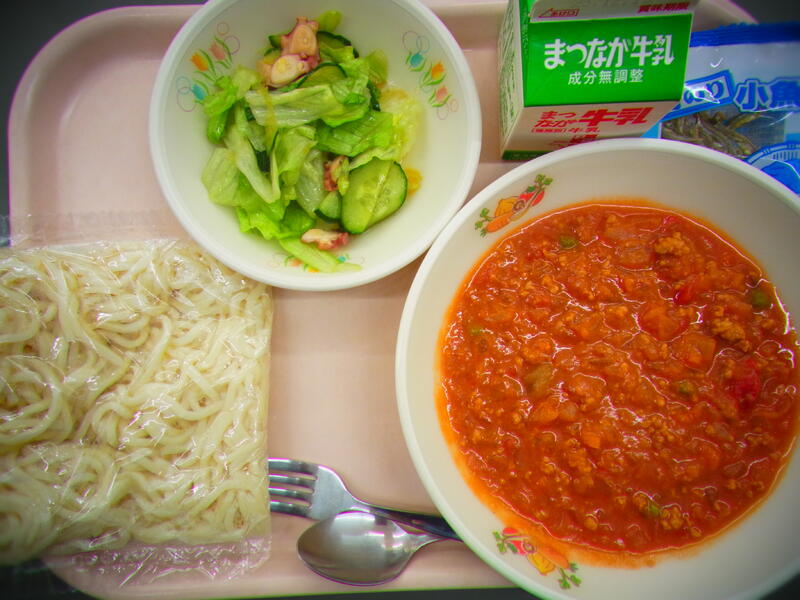 今日の給食は「スパゲティミートソース、たこときゅうりのかみかみサラダ、青のり小魚」です。