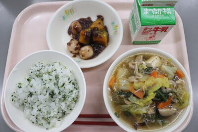 今日の給食は「いりこ菜めし、すきやき煮、白玉入り冬至かぼちゃ」です。