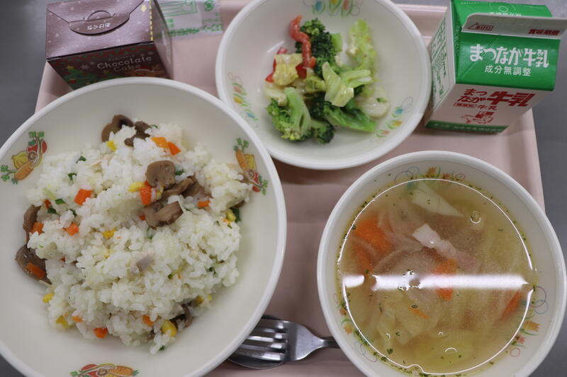 今日の給食は「チキンピラフ、ブロッコリーのサラダ、野菜スープ、クリスマスケーキ」です