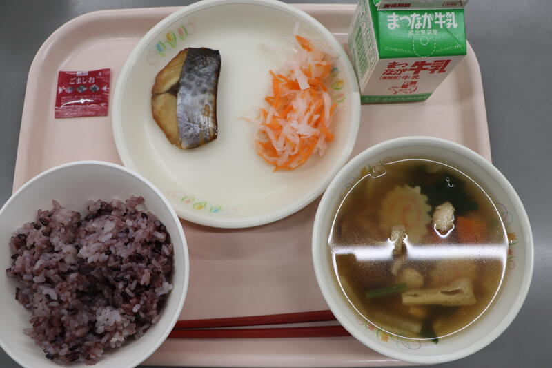 今日の給食は「紫黒米ごはん、さわらの照り焼き、紅白なます、白玉入り雑煮」です。