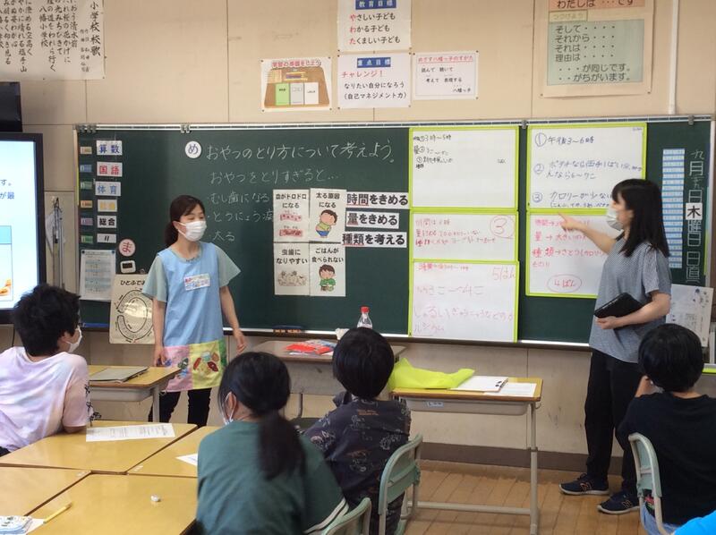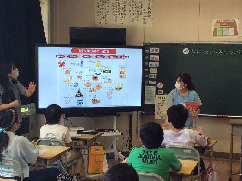 講師に栄養教諭をお招きし4年生に対し「おやつのとり方について考えよう」というめあてで栄養教室を実施していただきました。「市販のポテトチップスのカロリーはごはん約3杯分」「おやつのカロリーは目安200kcal」など、おやつに関して知識を深めることができました。