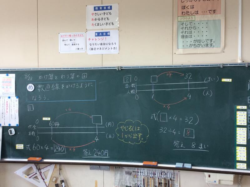 子どもたちは、式を考える時に数直線を使うと便利であることを実感したようです。今後は、式を考える時だけでなく、その式になる理由を考える時にも、数直線を使えるように指導していきたいと思います。