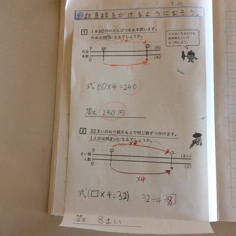 昨日の3年生の算数の学習です。「1本60円のえんぴつを4本買います。代金は何円になるでしょうか。」この問題を数直線にかいて考えました。今回初めて、子どもたちは数直線のかき方を学びました。左はしに0のめもりをとること、下の数直線に1のめもりをとることなどを、先生といっしょに確認しました。