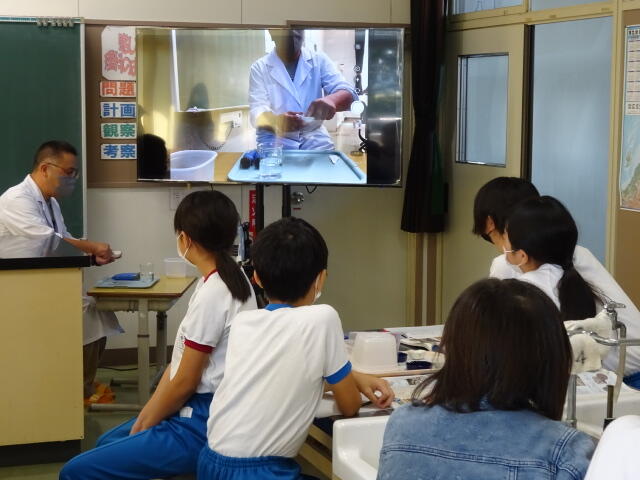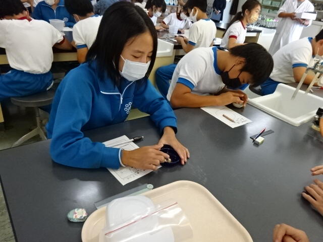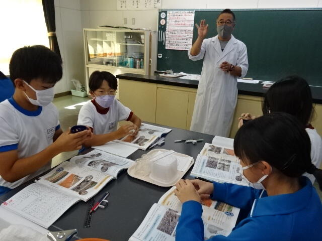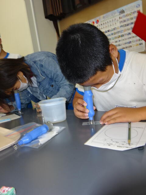 子どもたちは、わんかけ法でつぶを取り出し、マイクロスコープで観察しました。