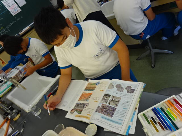 最初に教科書を読んで、それぞれの働きでできた地層の土の粒の形について確認しました。