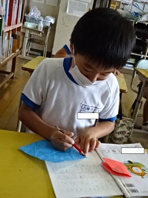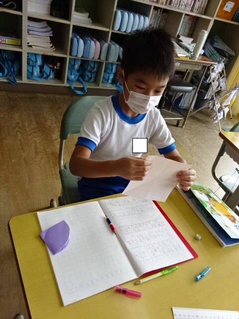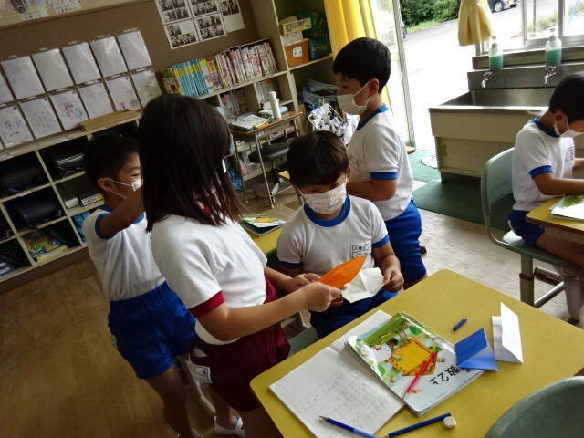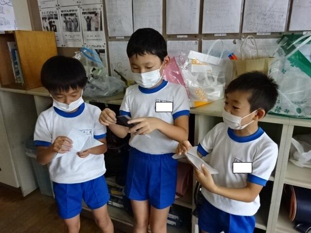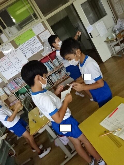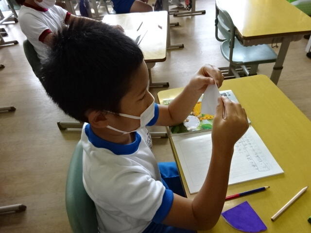 子どもたちは、折り紙を小さく折りたたんで確かめていました。
