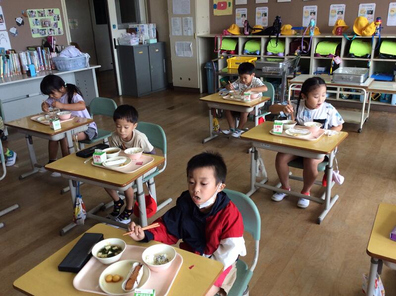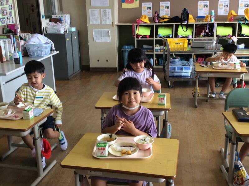 今日の給食は、十五夜給食でした。献立は、さつま芋ごはん、牛乳、鮭のみそ焼き、すまし汁、みたらしだんごで、秋の味覚を十分に楽しむことができました。1年生にも、さつま芋ご飯は大好評でした。