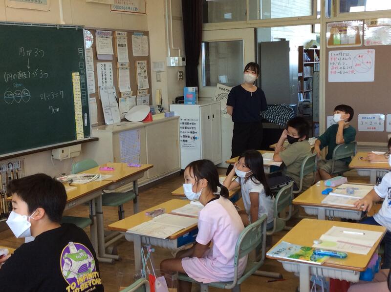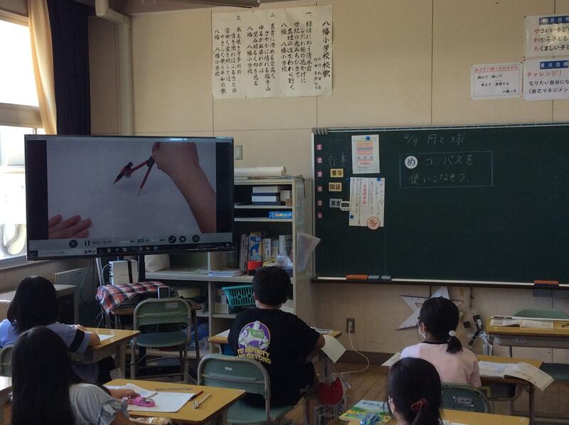 今日の5校時目の3年生の授業の様子です。算数の学習で、初めてコンパスを使って円をかく学習をしました。