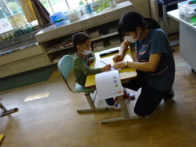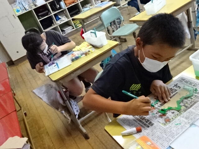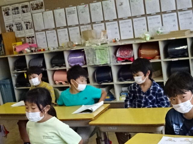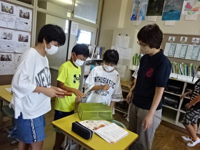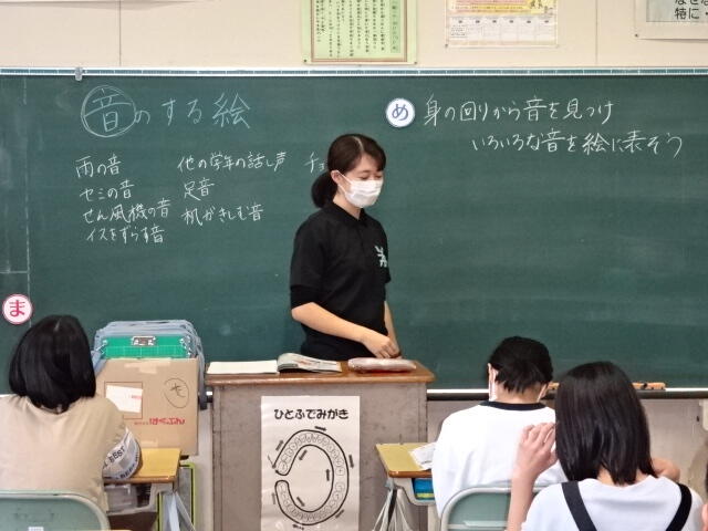 その後、校舎内を歩いて音探し。今日は、雨が降る音、セミが鳴いている音等、耳を澄ますと、いろいろな音が聞こえてきました。