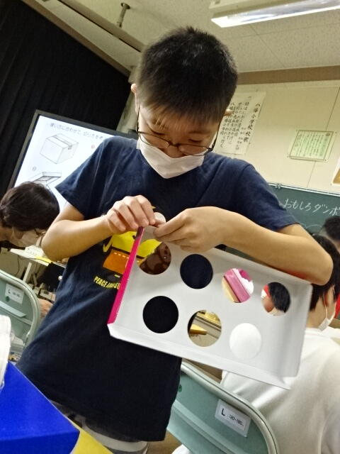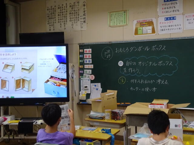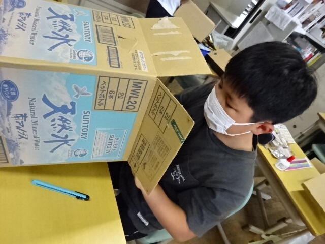子どもたちは、持ってきたダンボールをいろいろな角度から見て構想を練っていました。