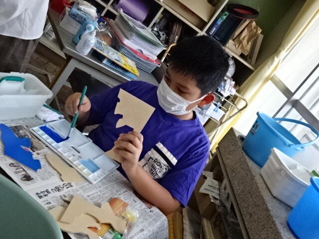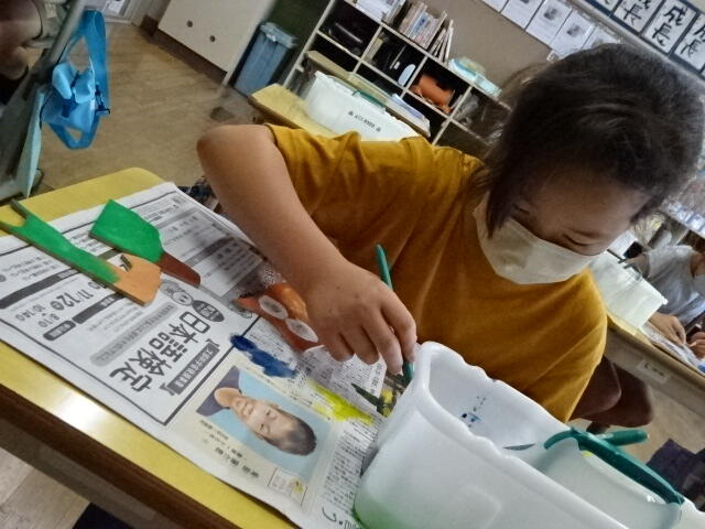 1学期に電動イトノコで切った板を組み合わせて、どんな作品にしようか考えながら色を塗りました。板に色を塗るのには、絵の具と水の量が大切です。
