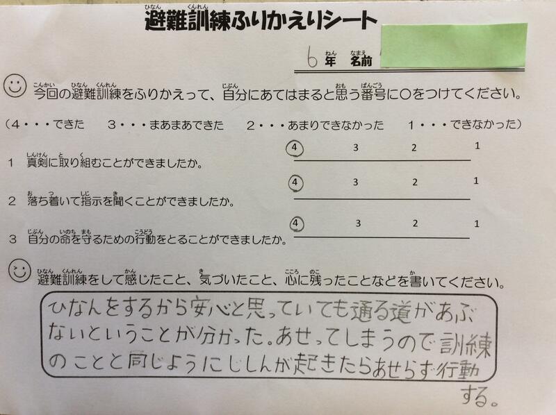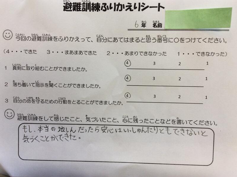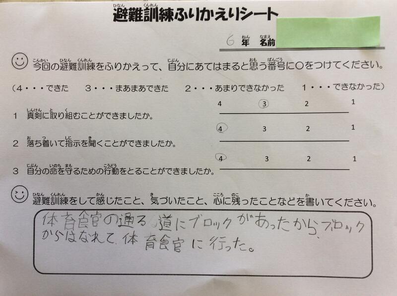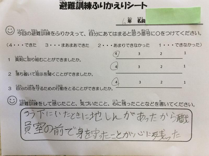 この後は、こどもたちは教室に戻り、校内放送で校長先生の話を聞きました。地震はいつ起きるか分かりません。地震が起きた時には、まずは安全な場所で頭を守って地震がおさまるまで待つこと、地震がおさまったら安全な場所に落ち着いて避難することを確認しました。