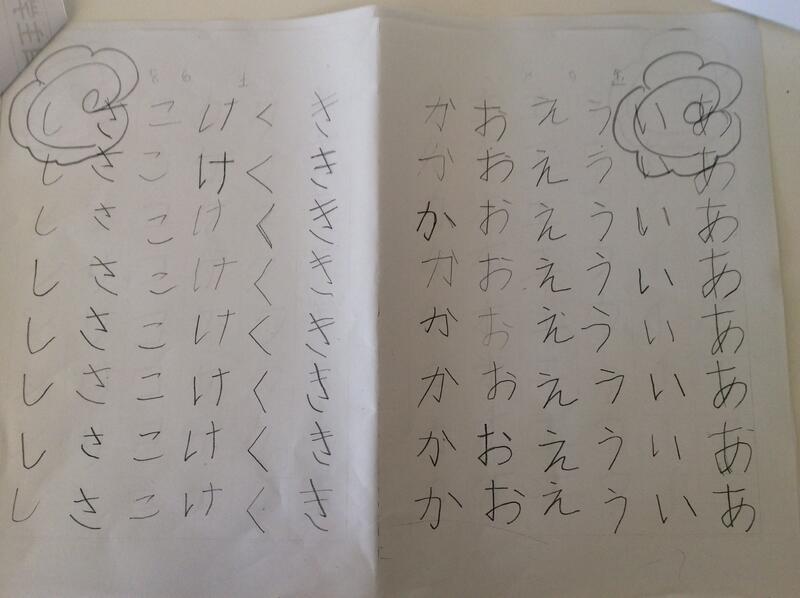 1年生のノートです。お手本をよく見て、ひらがなを1字ずつていねいに書いています。