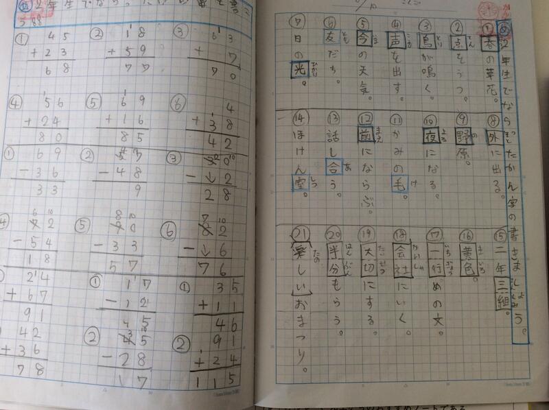 3年生のノートです。2年生で学習した計算や漢字の復習など、自分に合った学習を毎回ていねいにしています。
