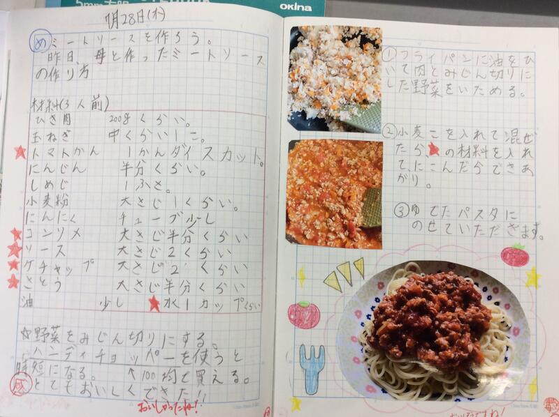 5年生のノートです。夏休みに読んだ本の感想や新聞記事の考察、家庭科の料理研究というように、国語や算数以外の学習もしています。幅広い学習のしかたが参考になります。