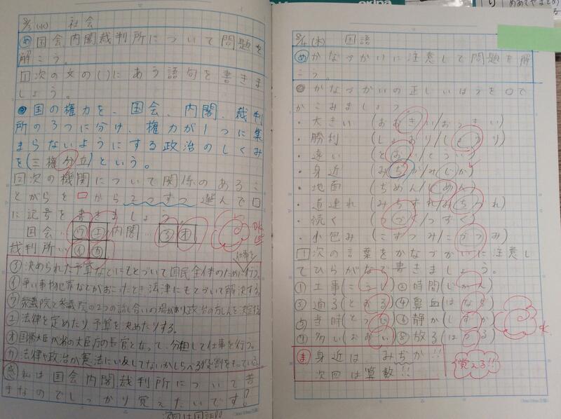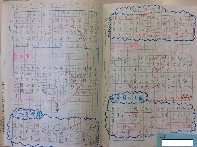 4年生のノートです。ドリル的な学習だけでなく、下のような調べ学習もしているところがいいですね。