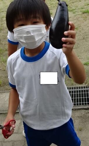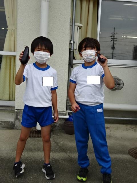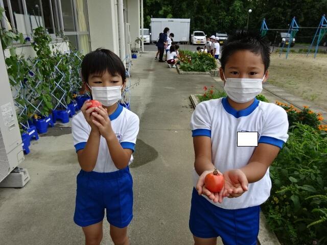 花壇の草むしりをしていたところ、ナスとトマトが大きくなっていることに気付いた子どもたち。