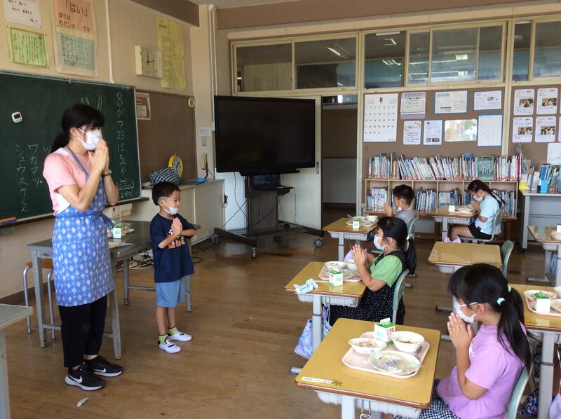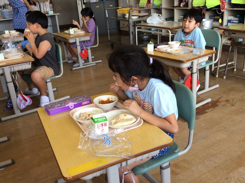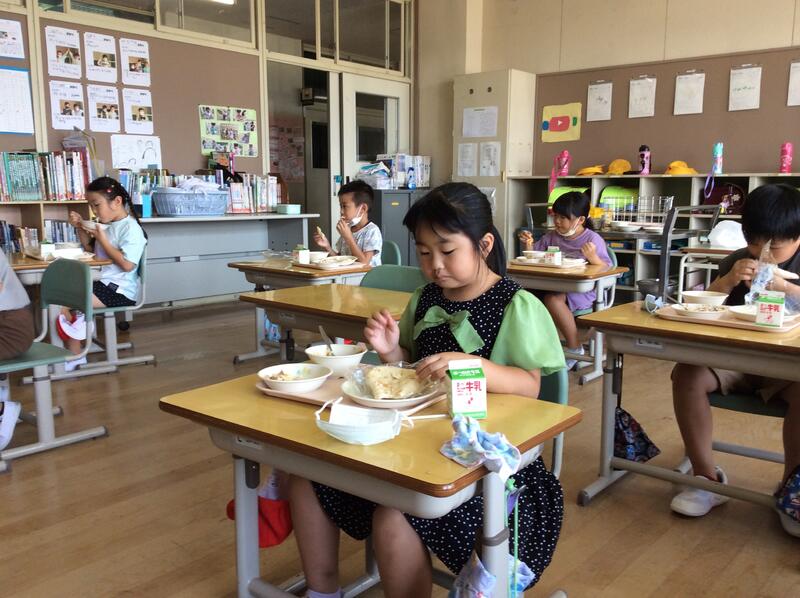 本日は、2学期最初の給食の日でした。献立は「ナン・キーマカレー・牛乳・かみかみあえ」でした。1年生の中には初めてナンを食べる子もいて、興味津々の様子。ちぎって、カレーをつけて上手に食べることができました。