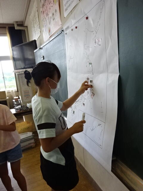 産地名を手掛かりに、日本地図に切り抜いたちらしを貼っていきました。