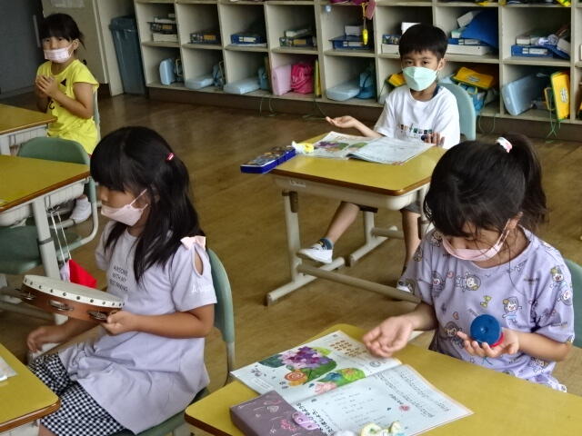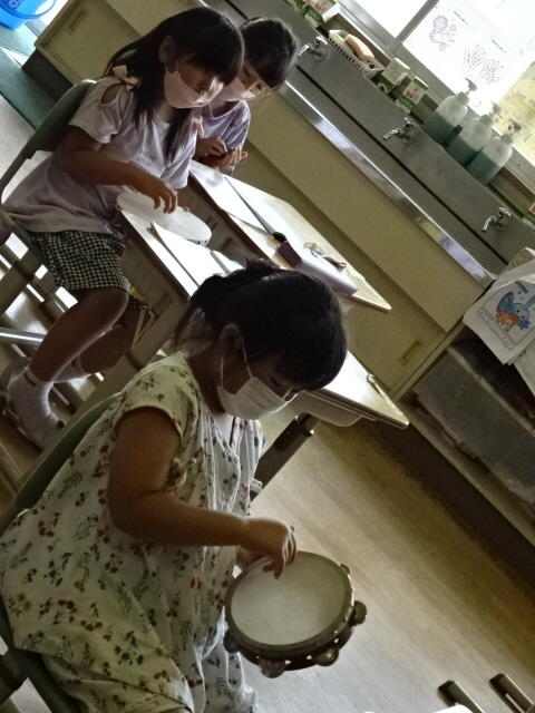 今まで学習した歌に合わせて、タンブリンとカスタネットでリズム打ちをしました。